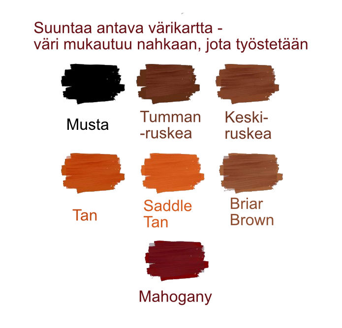 Meil on monia värejä, joita voit valita, ja jokaisen tuotteen kuvalta löydät värikartan, joka auttaa sua valitsemmaan just sen oikeen sävyn. Mutta muista, että värit ei oo ihan täsmälleen samat ku kuvassa, koska nahka ottaa väriä itseensä eri tavoin ja joka näyttö voi näyttää värit vähän eri tavalla. Eli jokainen tuote on uniikki ja vähän erilainen ku mitä sä oot kuvitellu!