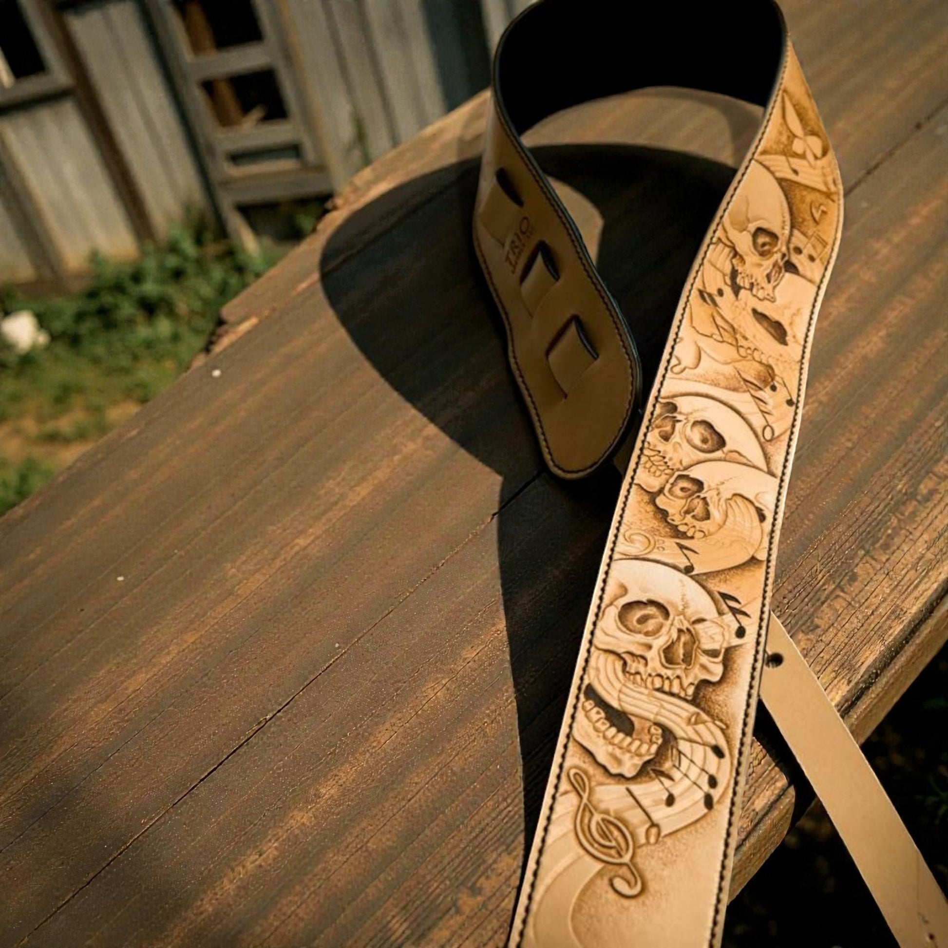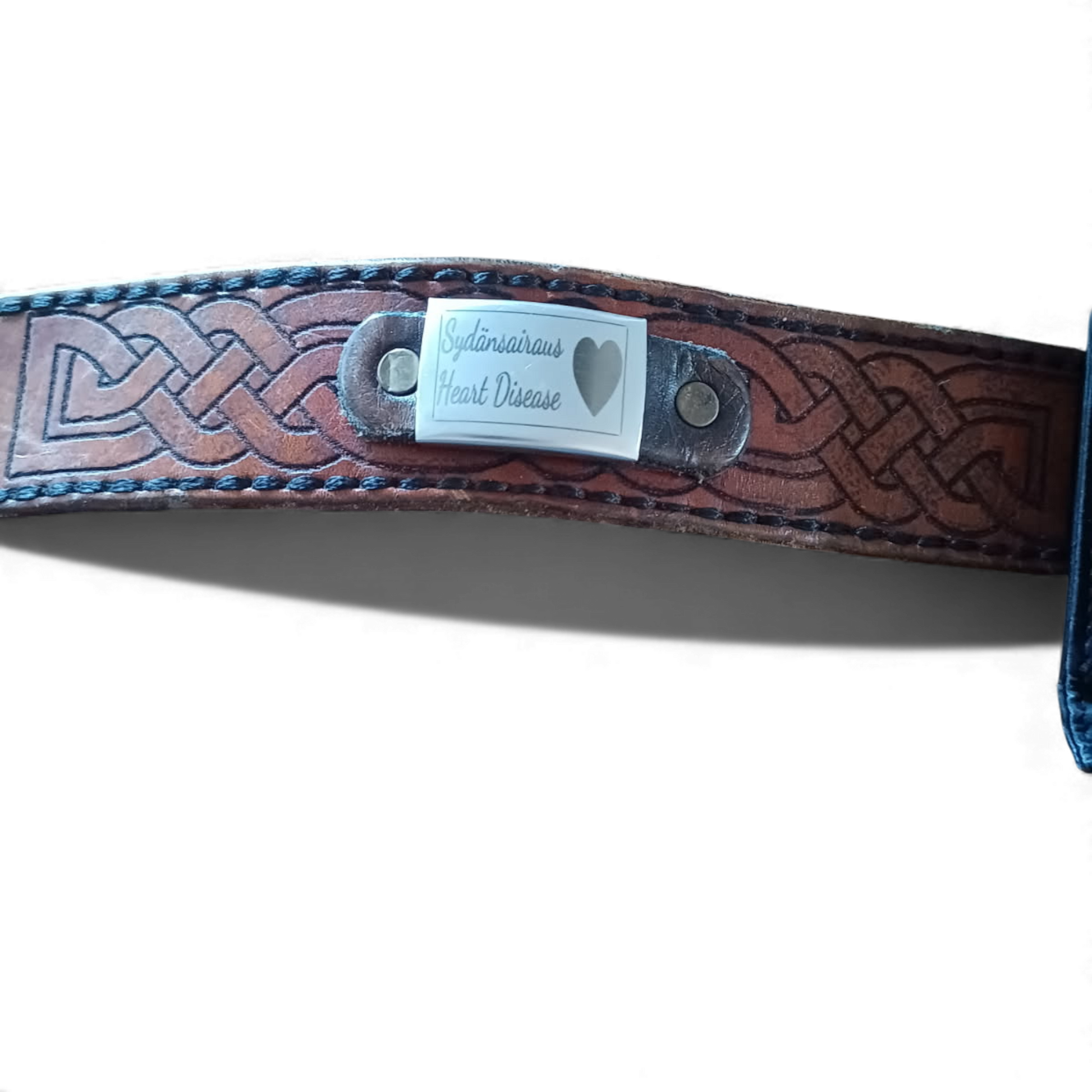 Nyt mää sanon suoraan, tää nahkaranneke ei oo mikään hentoinen koru, vaan ranteeseen tuleva kannanotto. Tää on tehty nahasta, joka näyttää elämää nähneeltä jo uutena, ja siihen saa just sen kuvion mikä sopii sun tarinaan. Sulka, keltti, pääkallo, ruusu, nimikointi tai moottoripyörän merkki, käsin pakotettuna tai laserkuviolla, tai sit täysin blanco jos haluut antaa hiljaisen uhkailun puhua puolestaan. Ja jos järki kulkee mukana, metallilaattaan saa medical information -merkinnät, sydänvaivaiselle sydänkuva ja yhteystiedot, ettei tarvii arpoa jos jotain sattuu.